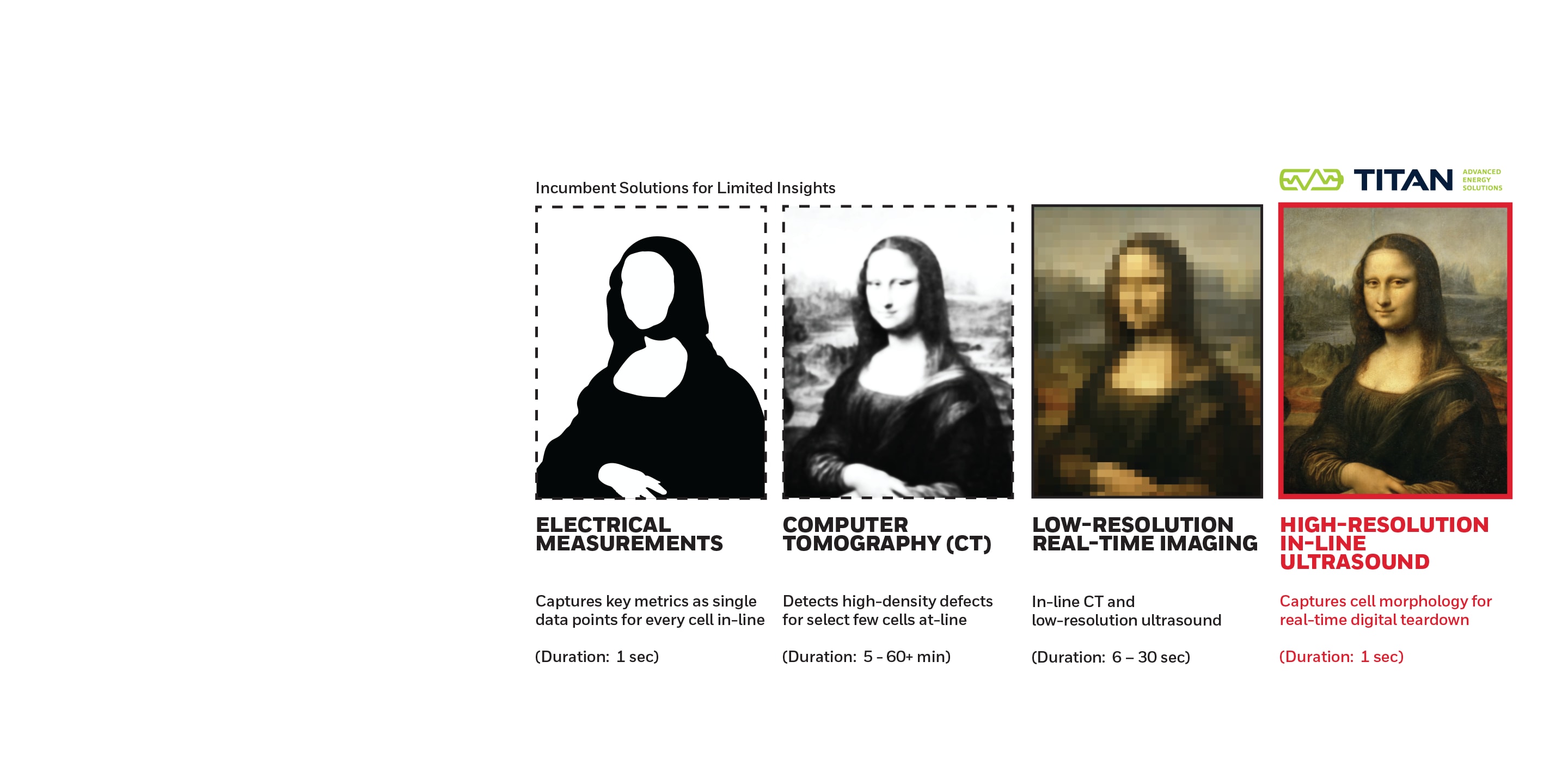 Ultrasound adds a unique dimension by probing cells in less than one second / cell from multiple perspectives – electrical defects, electrochemical defects and physical defects. In practice, this means detecting defects like misalignments, gas pockets, lithium plating, electrolyte wettability and much more.